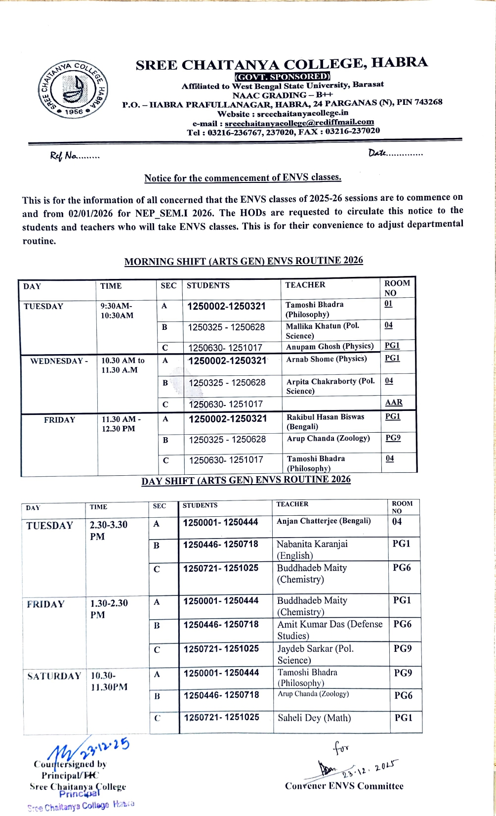 Notice for ENVS Class Routine and Commencement – 2025–26