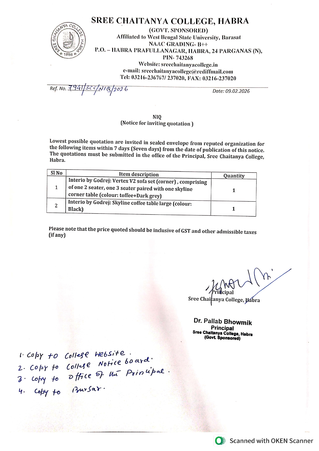 Notice Inviting Quotation (NIQ) for Supply of Furniture Items