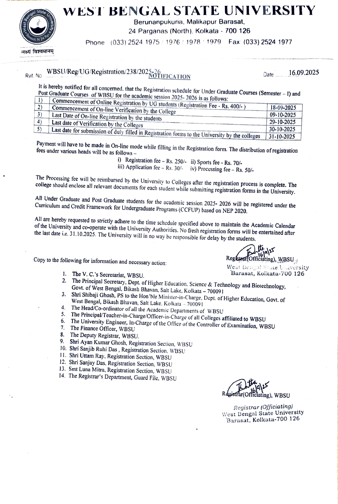 Registration Schedule for UG & PG Courses (Academic Session 2025–2026) – West Bengal State University