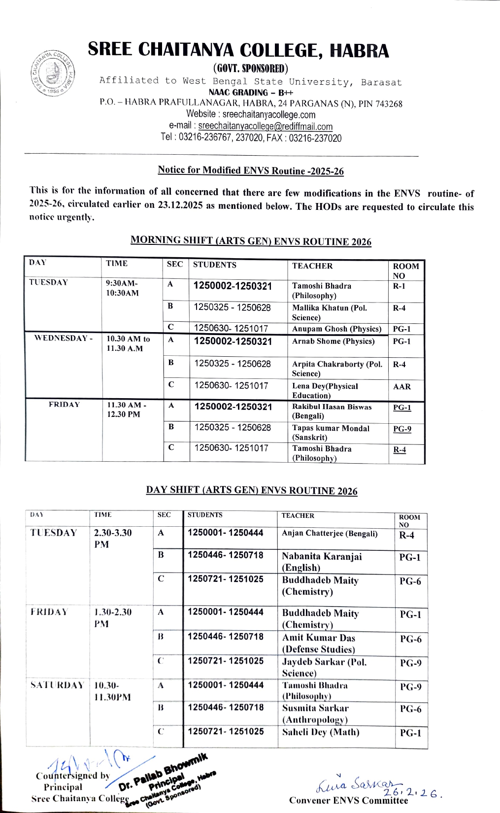 Notice for ENVS Class Routine and Commencement – 2025–26