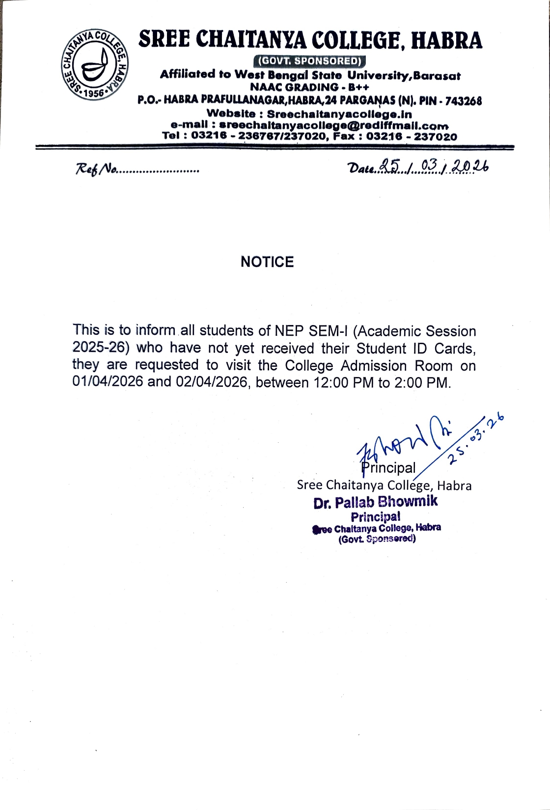 Notice for NEP Semester-I Students Regarding Collection of Student ID Cards - 2025–2026