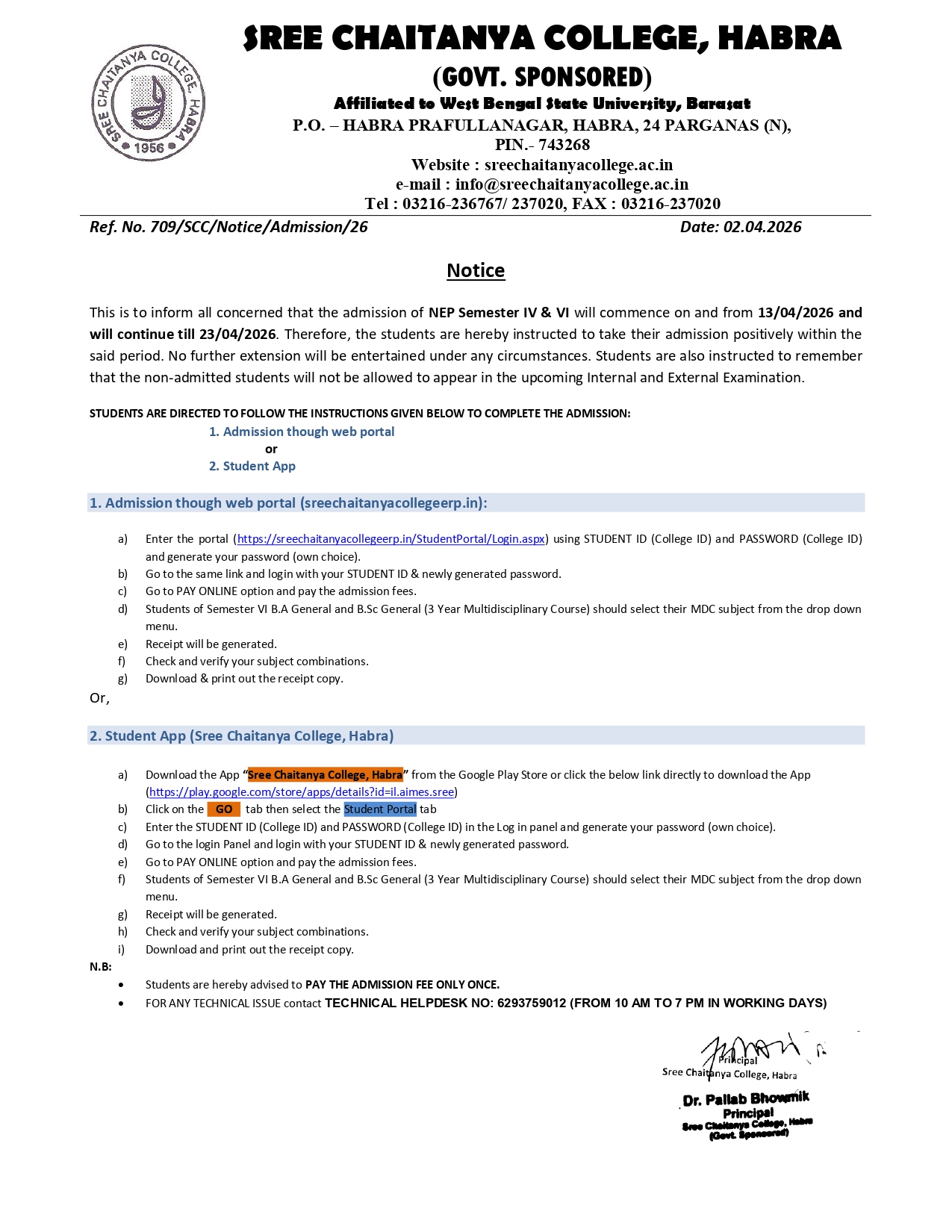 Notice for opening of admission portal for sem IV& VI