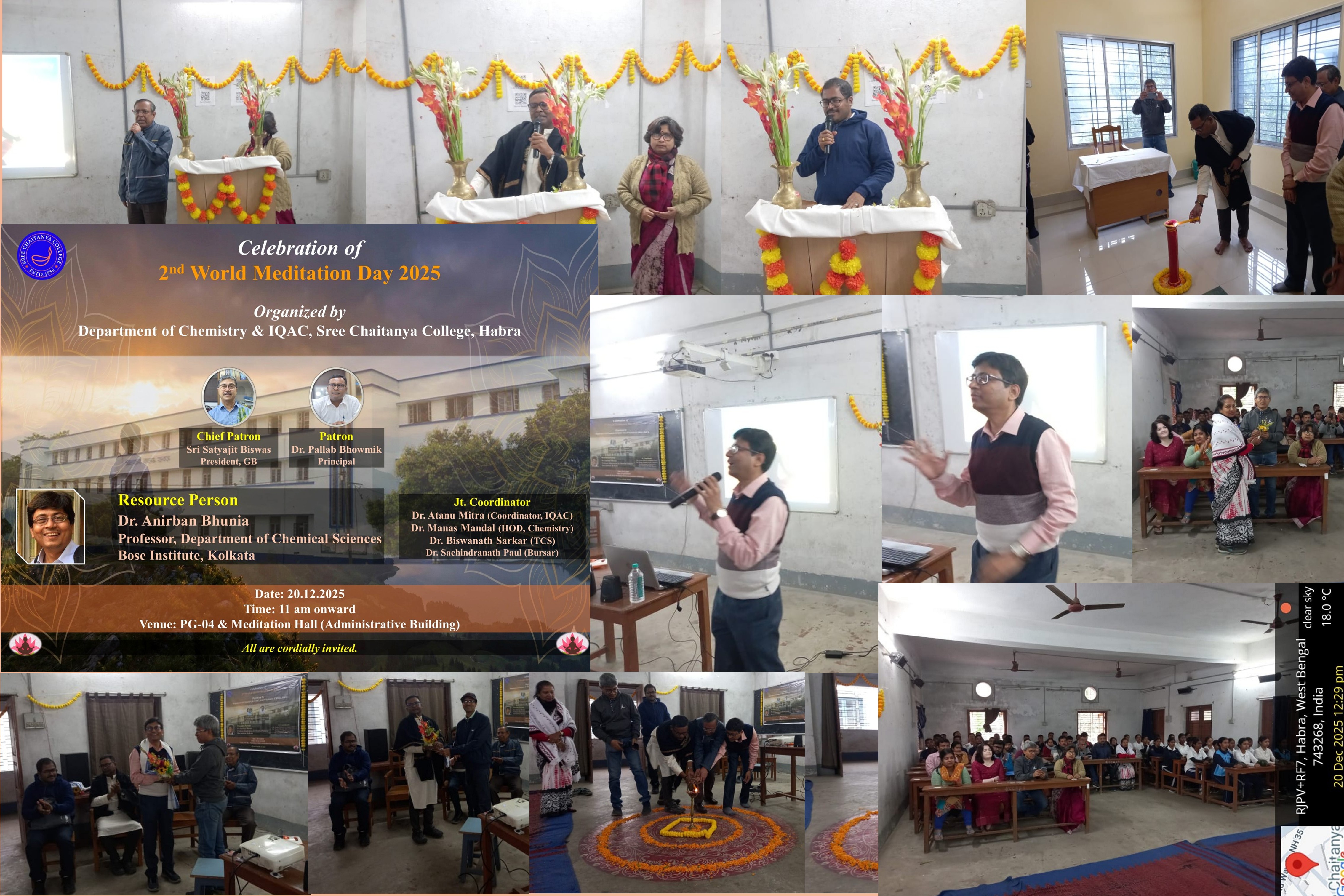 The 2nd World Meditation Day 2025 was celebrated on 20 December 2025 at Sree Chaitanya College, featuring Dr. Anirban Bhunia of Bose Institute, Kolkata, as the main resource person.